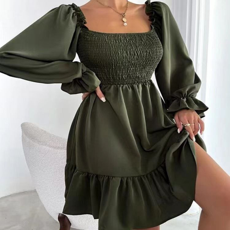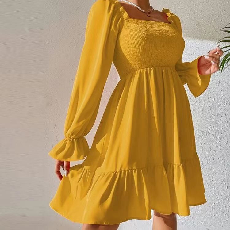 Robe de couleur unie 2023 printemps style minimaliste européen et américain col carré taille haute manches longues robe taille mince pour les femmes