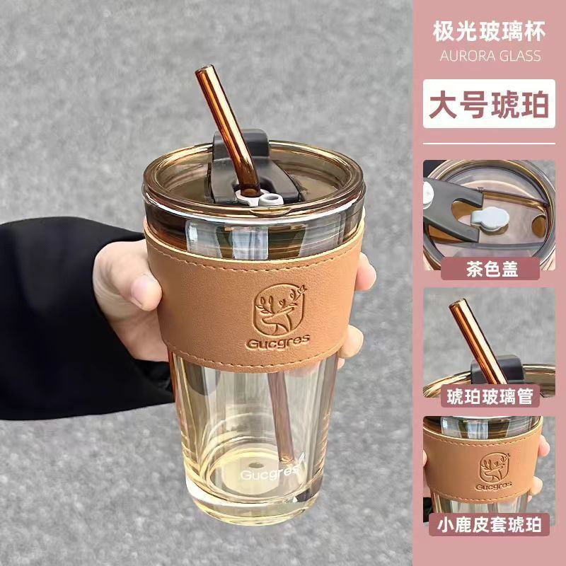 Tasse nouveau style femmes 2024 tasse en verre de paille haute aurores boréales tasse de paille avec couvercle tasse à café de bureau étudiant