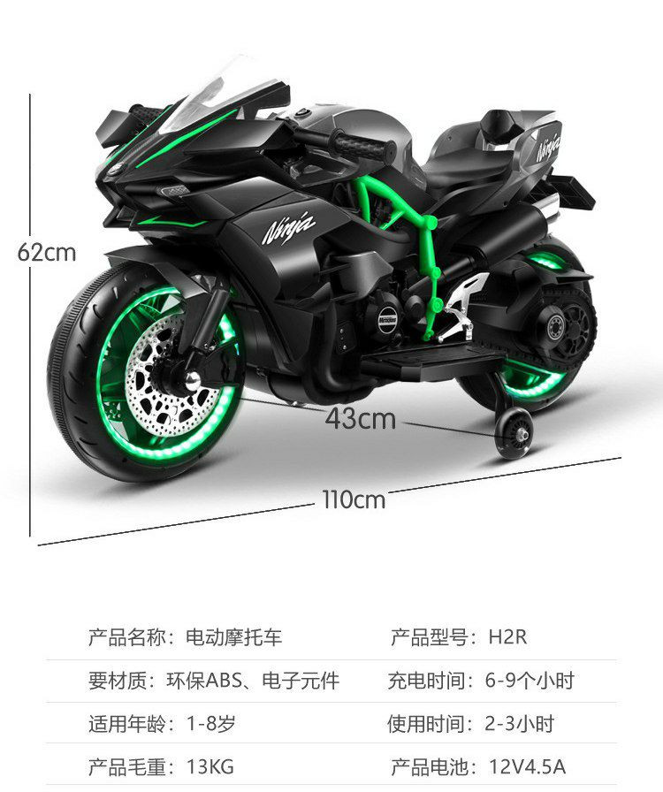 Moto électrique rechargeable à deux roues pour enfants, jouet pour enfants de type Kawasaki Ninja H2, un modèle réduit inspiré de la célèbre moto hypersportive. Une batterie de moto à deux roues électrique pour enfants