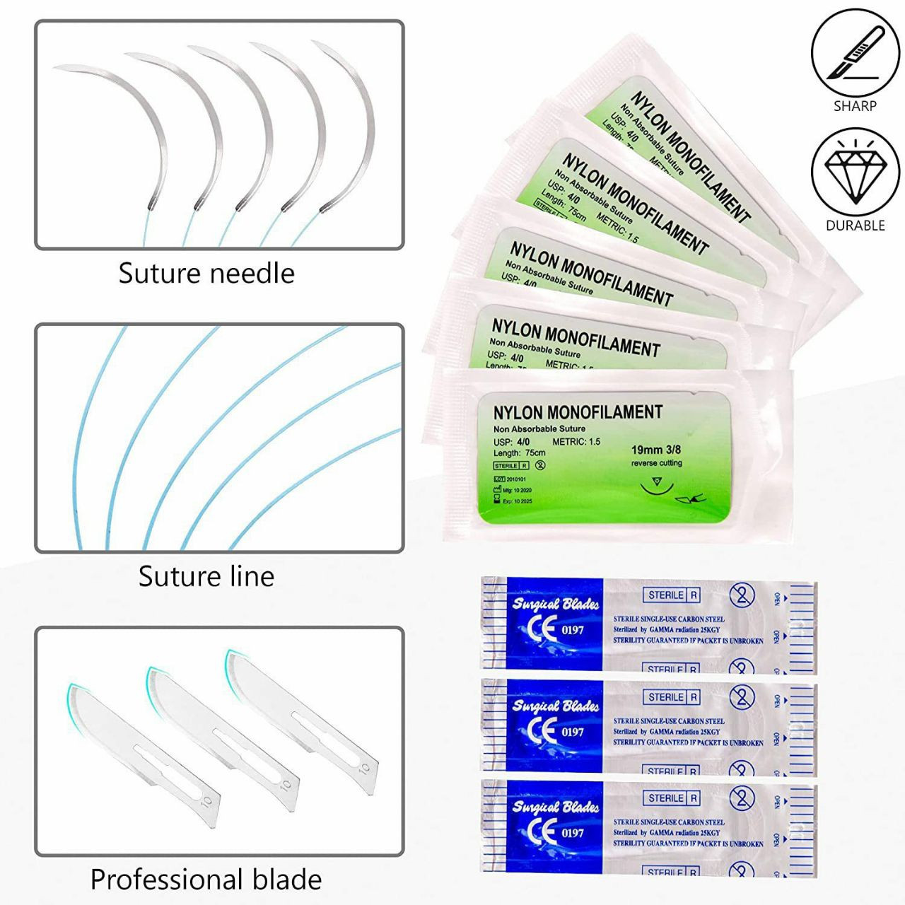 kit complet de pratique de suture pour l'entraînement à la suture comprenant un grand tampon de suture en silicone avec des plaies prédécoupées, 14 morceaux d'outils d'anatomie biologique, ciseaux d'aiguille en acier inoxydable, équipement expérimental, outils, sondes, ciseaux et pinceaux d'instruments d'enseignement