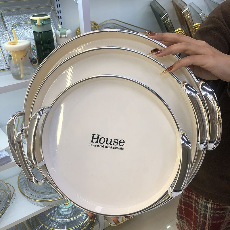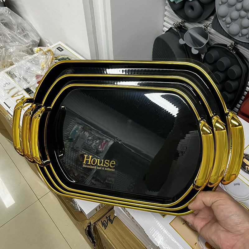 Ensemble de trois plateaux de service blancs et noires de différentes tailles, avec des bords dorés et des poignées dorées en forme de perles et autres.