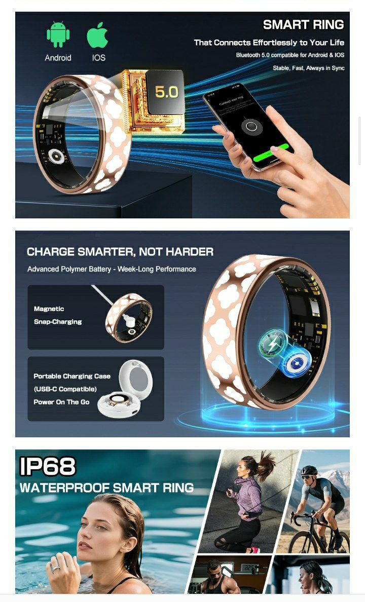 Smart Ring, Bague intelligente pour fréquence cardiaque, sang oxygène sommeil exercice podomètre surveillance étanche multifonction pour Femmes et Hommes,