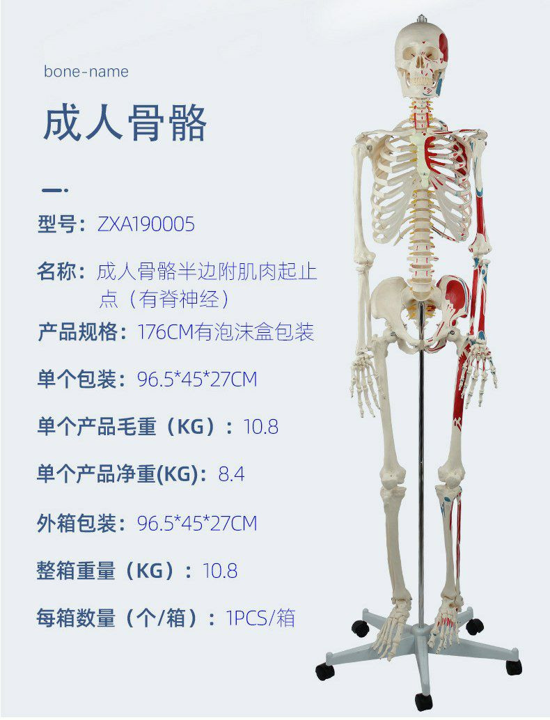 La moitié du squelette adulte est reliée par des origines et des extrémités musculaires (avec des nerfs spinaux). Le fabricant fournit du matériel d'enseignement médicalnatomique de squelette humain adulte.